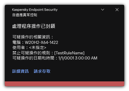 當惡意應用程式嘗試執行操作時,Kaspersky Endpoint Security 將封鎖該操作並顯示通知(請參見下圖)。