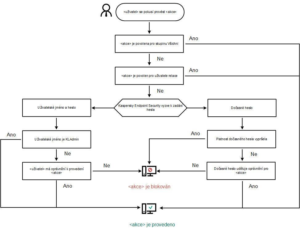 Aplikace Kaspersky Endpoint Security určí, zda povolit nebo blokovat akci chráněnou heslem, na základě následujícího algoritmu (viz obrázek níže).
