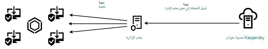 يتم توزيع حزمة التحديث على أجهزة الكمبيوتر العميلة بواسطة مهمة تحديث الخاصة ببرنامج Kaspersky Endpoint Security. يمكنك إنشاء عدد غير محدود من مهام التحديث لكل مجموعة إدارة.