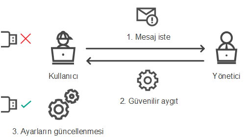 Kaspersky Security Center kuruluşunuzda dağıtılmamışsa, Kaspersky Endpoint Security ayarlarında bir aygıta erişim sağlayabilirsiniz. Örneğin aygıtı güvenilir listesine ekleyebilir ya da geçici olarak Aygıt Denetimini devre dışı bırakabilirsiniz.