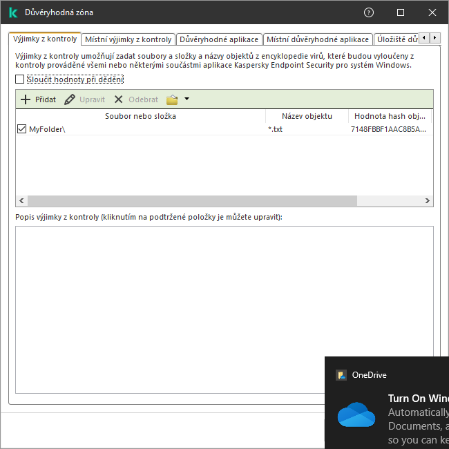 Chcete-li z kontroly vyloučit jednotlivý soubor, do pole Hodnota hash souboru zadejte hodnotu hash tohoto souboru.