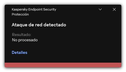 Como resultado, cuando Kaspersky Endpoint Security detecta un intento de ataque de red contra el equipo del usuario, bloqueará todas las conexiones de red con el equipo atacante. Kaspersky Endpoint Security crea el evento de Ataque de red detectado. El evento contiene información sobre el equipo atacante: direcciones IP y MAC.