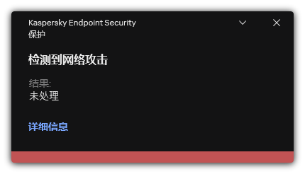 结果,当 Kaspersky Endpoint Security 检测到针对用户计算机的网络攻击企图时,它将阻止与攻击计算机的网络连接。Kaspersky Endpoint Security 创建“检测到网络攻击”事件。事件包含有关攻击计算机的信息:IP 和 MAC 地址。