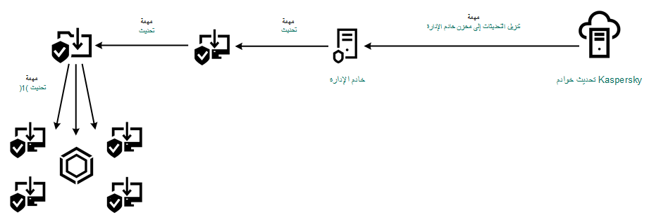 يتم توزيع حزمة التحديث على أجهزة الكمبيوتر العميلة بواسطة مهمة تحديث الخاصة ببرنامج Kaspersky Endpoint Security. يمكنك إنشاء عدد غير محدود من مهام التحديث لكل مجموعة إدارة.