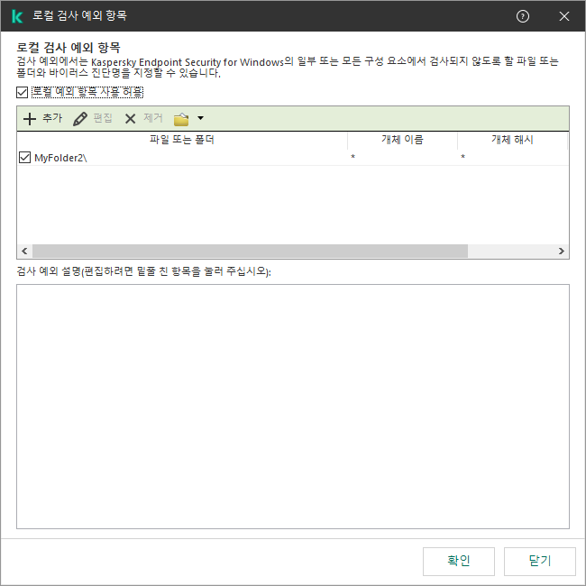 특정 유형의 개체를 검사에서 제외하려면 개체 필드에 Kaspersky Encyclopedia의 분류에 따라 개체 유형의 이름을 입력합니다(예: Email-Worm, Rootkit 또는 RemoteAdmin).