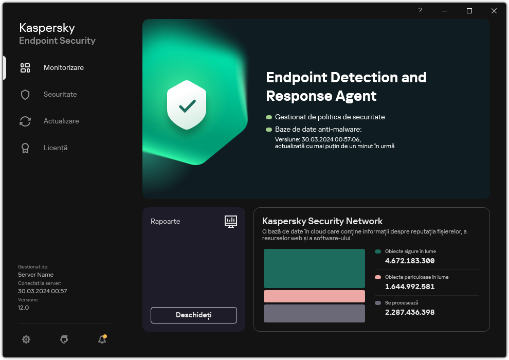 Drept urmare, aplicația Agent EDR pentru integrarea cu Kaspersky Anti Targeted Attack Platform (EDR) este instalată pe computer. Poți confirma faptul că aplicația este instalată și să verifici setările aplicației inițiind comanda status.