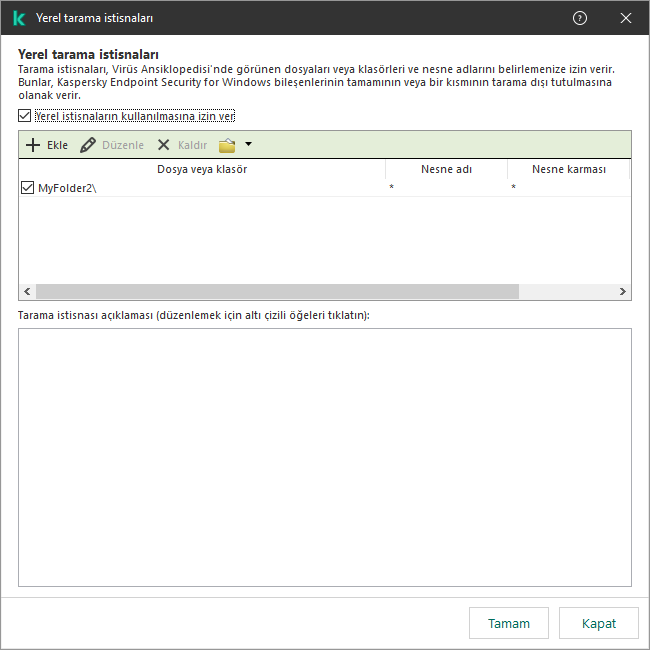 Eğer taramalardan nesnenin belirli türünü dışlamak istiyorsanız, Nesne alanında Kaspersky Ansiklopedisinin sınıflandırmasına göre nesnenin adını girin (örneğin Email-Worm, Rootkit veya RemoteAdmin).