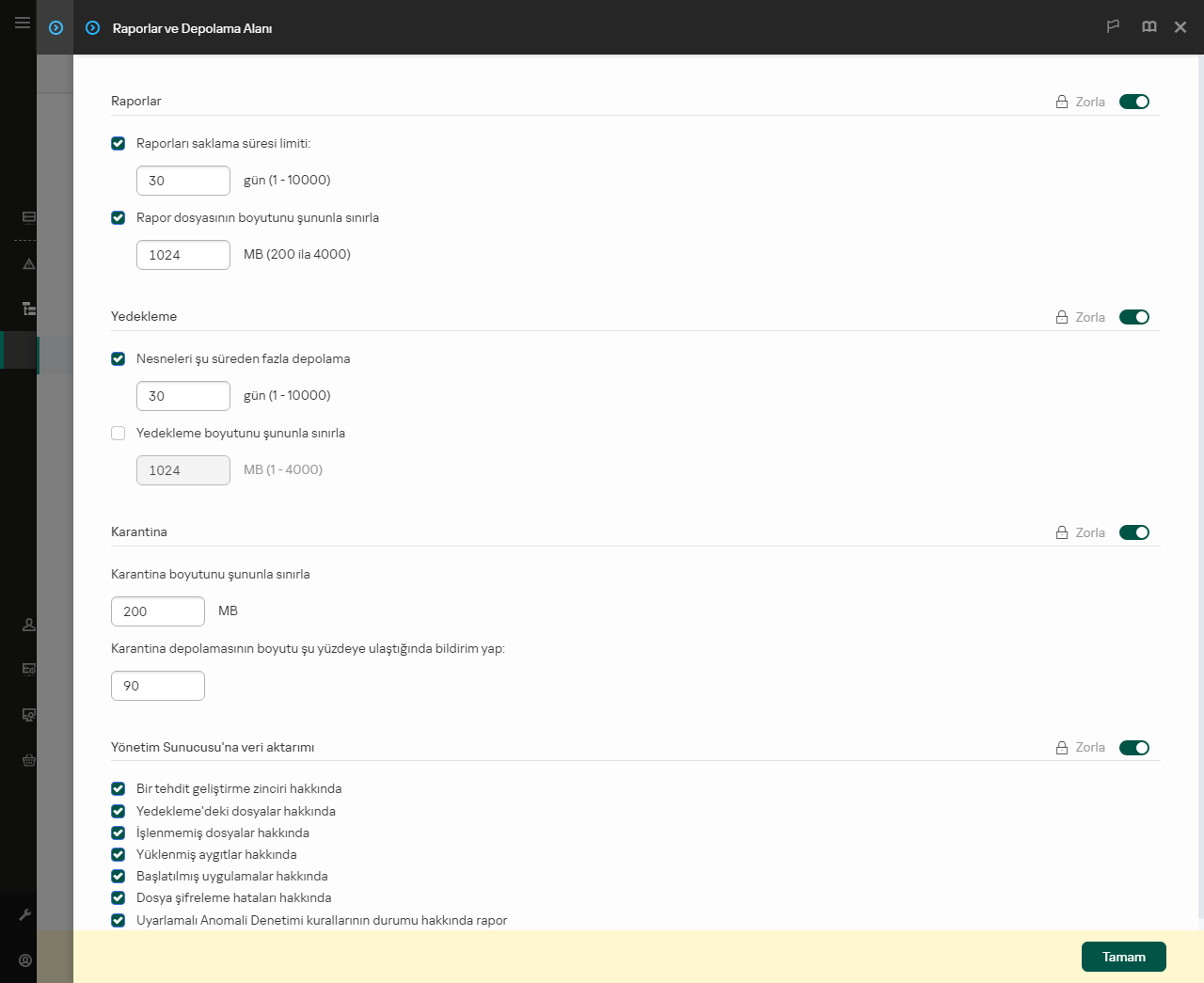 Yüklü uygulamaların veritabanını güncel tutmak için, uygulama bilgilerinin Yönetim Sunucusu'na gönderilmesi etkinleştirilmelidir (varsayılan olarak etkindir).