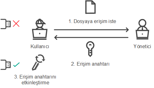 Çevrimdışı modda engellenen bir hizmete erişim verme, ancak Kaspersky Security Center kuruluşta dağıtıldıysa ve bilgisayara bir ilke uygulandıysa yapılabilir. İlke ayarlarında Aygıt Denetimi bölümünde yer alan Geçici erişim isteğine izin ver onay kutusu seçilmelidir.
