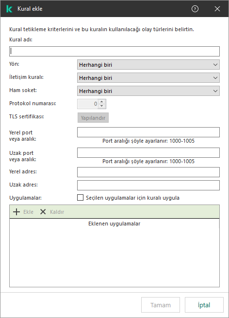 Kaspersky Endpoint Security, kural tetikleme kriterlerini mantıksal bir VE ile birleştirir.