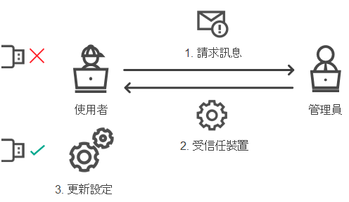 只有在組織中佈署了卡巴斯基安全管理中心且已將某個政策套用於電腦時,才能以線上模式授予對封鎖的裝置的存取權限。電腦必須能夠與管理伺服器建立連線。