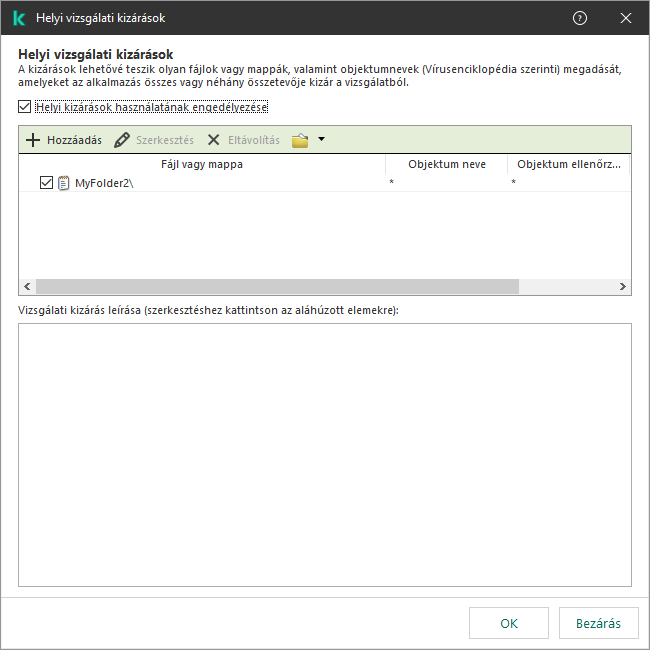 Új kizárás. A Kaspersky Endpoint Security egy új vizsgálati kizárást ad hozzá a lista gyökeréhez.