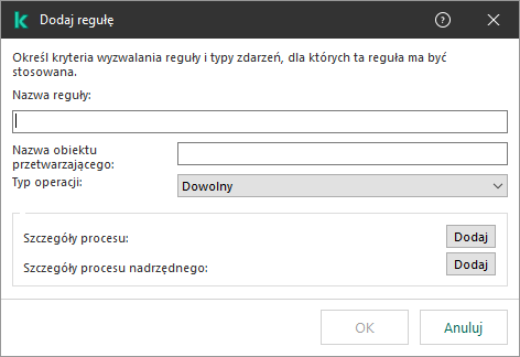 Kaspersky Endpoint Security łączy kryteria wyzwalania reguły z logicznym AND.