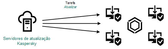 O pacote de atualização é distribuído a computadores clientes pela tarefa Atualização de bancos de dados e módulos do aplicativo do Kaspersky Endpoint Security. Você pode criar um número ilimitado de tarefas de atualização para cada grupo de administração.