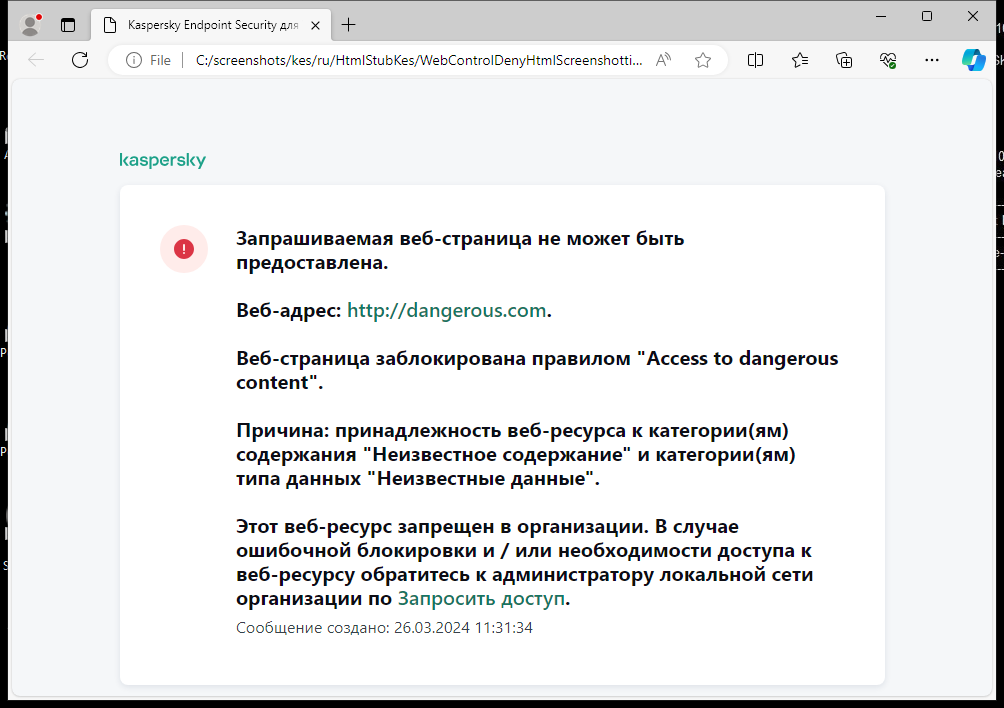 В зависимости от действия, заданного в свойствах правил Веб-Контроля, при попытке пользователей получить доступ к веб-ресурсам Kaspersky Endpoint Security выводит сообщение (подменяет ответ HTTP-сервера HTML-страницей с сообщением) одного из следующих типов: