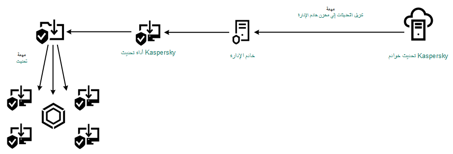 يتم توزيع حزمة التحديث على أجهزة الكمبيوتر العميلة بواسطة مهمة تحديث قواعد البيانات والوحدات النمطية للتطبيق الخاصة ببرنامج Kaspersky Endpoint Security. يمكنك إنشاء عدد غير محدود من مهام التحديث لكل مجموعة إدارة.