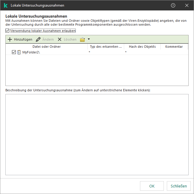 Neue Ausnahme. Kaspersky Endpoint Security fügt eine neue Untersuchungsausnahme am Anfang der Liste hinzu.