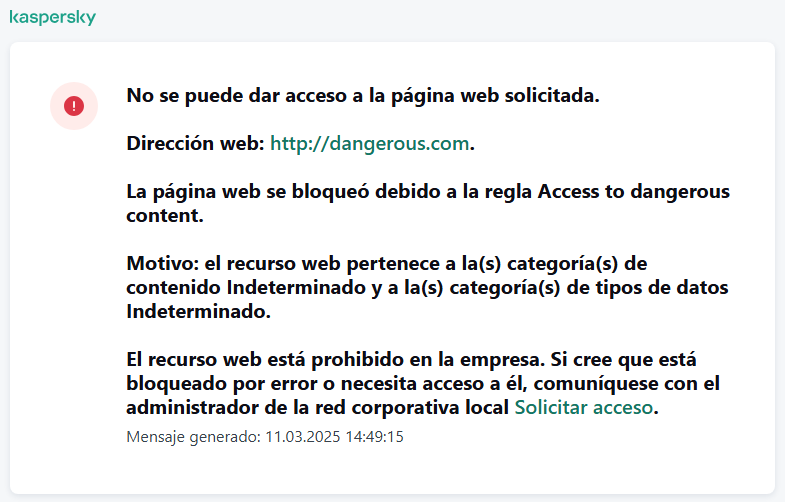 Si el usuario considera que el recurso web fue bloqueado por error, puede hacer clic en el vínculo del mensaje de notificación de bloqueo del recurso web para enviar un mensaje generado previamente al administrador de la red corporativa local.