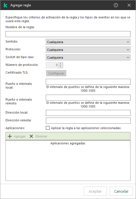 Kaspersky Endpoint Security combina los criterios de activación de la regla con un operador lógico AND.