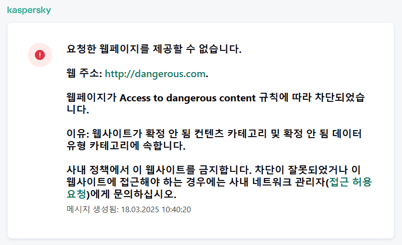 경고 메시지. 이 메시지는 해당 웹 리소스를 방문하는 사용자에게 권장하지 않거나 또는 기업 보안 정책을 위반하는 것이라고 경고합니다. Kaspersky Endpoint Security는 해당 웹 리소스를 설명하는 규칙 설정에서 경고 옵션을 선택하면 경고 메시지를 표시합니다.