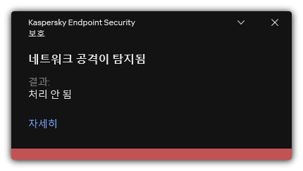 결과적으로 Kaspersky Endpoint Security는 사용자 컴퓨터에 대한 네트워크 공격 시도를 탐지하면 공격 컴퓨터와의 모든 연결을 차단합니다. Kaspersky Endpoint Security에서 네트워크 공격 탐지 이벤트를 띄웁니다. 이벤트에는 공격을 시도한 컴퓨터의 정보(IP 및 MAC 주소)가 포함됩니다.