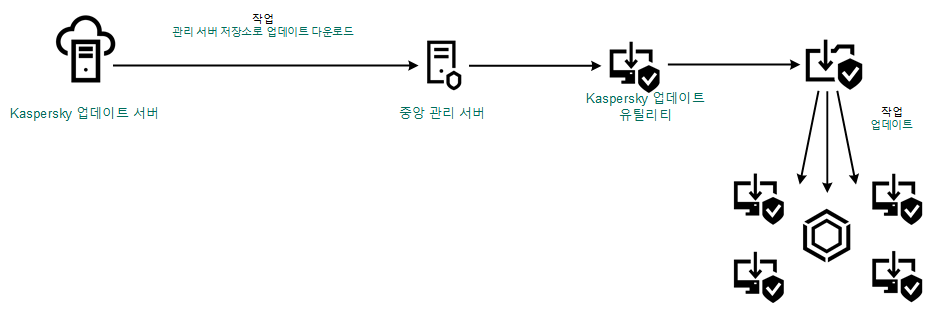업데이트 패키지는 Kaspersky Endpoint Security 데이터베이스 및 애플리케이션 모듈 업데이트 작업을 통해 클라이언트 컴퓨터로 배포됩니다. 각 관리 그룹에 대해 업데이트 작업을 수에 제한 없이 생성할 수 있습니다.
