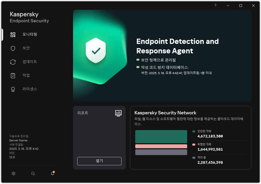 결과적으로 EDR Agent가 사용자 컴퓨터에 설치됩니다. 애플리케이션의 인터페이스를 사용할 수 있으며 알림 영역에