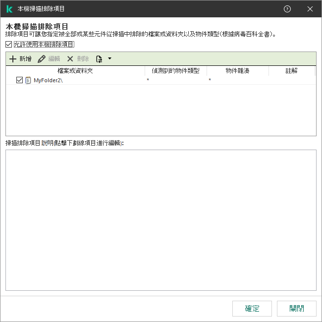 如果管理員允許建立本機信任區域,則使用者可以在應用程式的使用者介面中新增自己的掃描排除項目可信應用程式。同時,使用者無權修改或刪除政策中配置的信任區域中的物件。如果需要為單台電腦新增排除項目,管理員還可以在卡巴斯基安全管理中心主控台中查看、新增、修改或刪除清單項目。