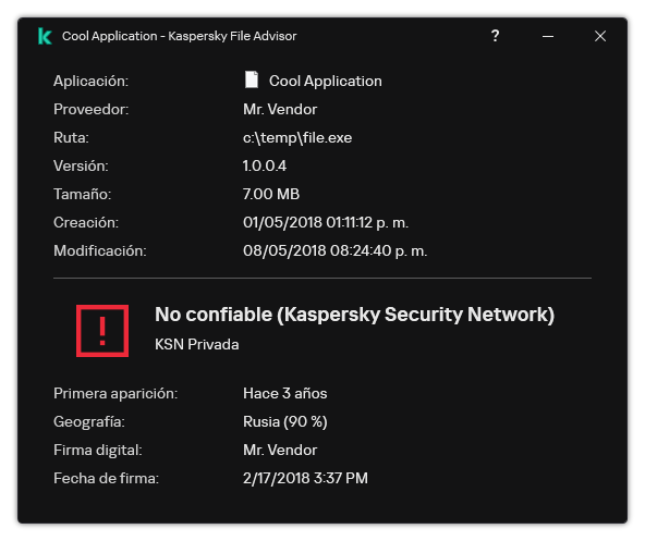Desconocida (Kaspersky Security Network). Kaspersky Security Network no cuenta con información sobre el archivo. Si desea analizarlo con las bases de datos antivirus, use la opción Buscar virus del menú contextual.