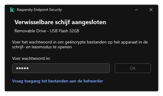 Als u het wachtwoord voor het werken in portable modus bent vergeten, moet u de verwisselbare schijf aansluiten op een computer waarop Kaspersky Endpoint Security is geïnstalleerd in het bedrijfsnetwerk. U krijgt toegang tot de bestanden omdat de geheime sleutel is opgeslagen in de sleutelopslag van de computer of op de Administration Server. Decrypt en encrypt bestanden opnieuw met een nieuw wachtwoord.