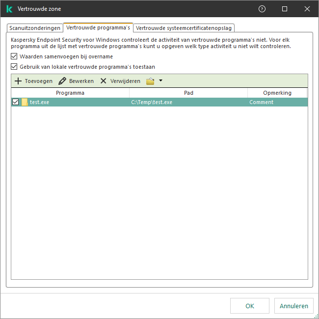 De lijst met vertrouwde programma's is een lijst met programma's waarvan de bestands- en netwerkactiviteit (inclusief schadelijke activiteit) en de toegang tot het systeemregister niet worden gemonitord door Kaspersky Endpoint Security. Standaard scant Kaspersky Endpoint Security objecten die worden geopend, uitgevoerd of opgeslagen door processen van programma's en controleert het de activiteit van alle programma's en het netwerkverkeer dat deze genereren. Een programma dat toegevoegd is aan de lijst met vertrouwde programma's, wordt echter uitgesloten van scans door Kaspersky Endpoint Security.