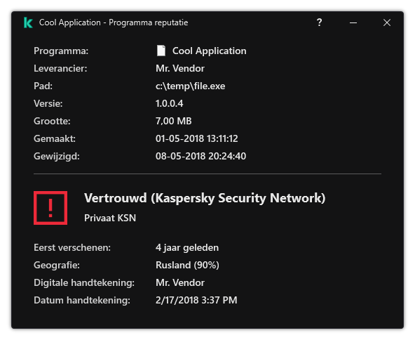 Vertrouwd (Kaspersky Security Network). De meeste gebruikers van Kaspersky Security Network hebben bevestigd dat het bestand te vertrouwen is.