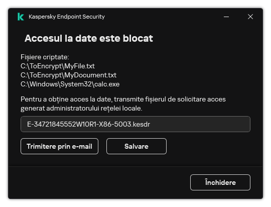 Pentru a începe procedura de recuperare, utilizatorul trebuie să încerce să acceseze un fișier. Drept urmare, Kaspersky Endpoint Security va crea un fișier de solicitare a accesului (un fișier cu extensia KESDC), pe care utilizatorul trebuie să-l trimită administratorului, de exemplu, prin e-mail.