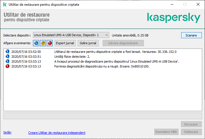 Datele necesare pentru restaurarea accesului la dispozitive criptate utilizându-se Utilitarul de restaurare sunt rezidente de câtva timp în memoria computerului utilizatorului în formă necriptată. Pentru a reduce riscul de acces neautorizat la astfel de date, te sfătuim să restaurezi accesul la dispozitive criptate pe dispozitive de încredere.