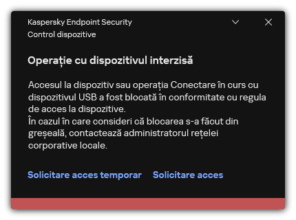Atunci când un dispozitiv blocat de componenta Control dispozitive este conectat la computer, Kaspersky Endpoint Security va bloca accesul și va afișa o notificare (vezi figura de mai jos).