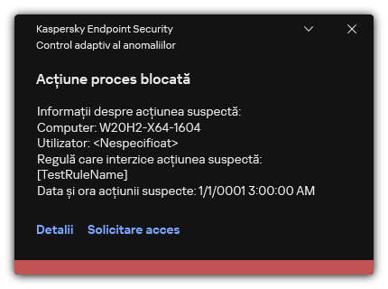 Mesaj despre blocare. Șablonul mesajului afișat unui utilizator atunci când este declanșată regula de Control adaptiv al anomaliilor care blochează o acțiune nespecifică. Mesaj către administrator. Șablonul mesajului potrivit căruia un utilizator poate fi trimis către administratorului rețelei corporative locale, dacă utilizatorul consideră că blocarea este o greșeală. După ce utilizatorul solicită accesul, Kaspersky Endpoint Security trimite un eveniment către Kaspersky Security Center: Mesaj către administrator privind blocarea activității aplicației. Descrierea evenimentului conține un mesaj către administrator cu variabile înlocuite. Puteți vizualiza aceste evenimente în consola Kaspersky Security Center, utilizând selecția de evenimente predefinită User requests. Dacă organizația dvs. nu are instalat Kaspersky Security Center sau nu există nicio conexiune la serverul de administrare, aplicația va trimite un mesaj administratorului la adresa de e-mail specificată. |