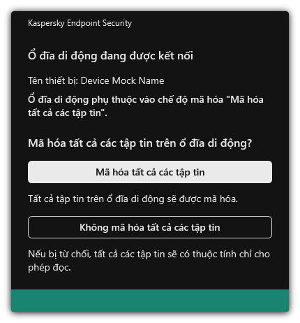 Sau khi áp dụng chính sách, khi người dùng kết nối một ổ đĩa di động hoặc nếu ổ đĩa di động đã được kết nối, Kaspersky Endpoint Security sẽ yêu cầu người dùng xác nhận thực hiện hoạt động mã hóa (xem hình bên dưới).