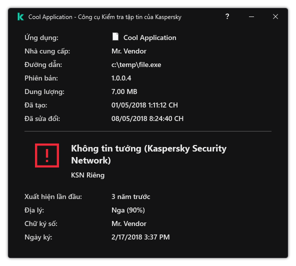 Tin tưởng (Kaspersky Security Network). Hầu hết người dùng của Kaspersky Security Network đã xác nhận rằng tập tin này được tin cậy.