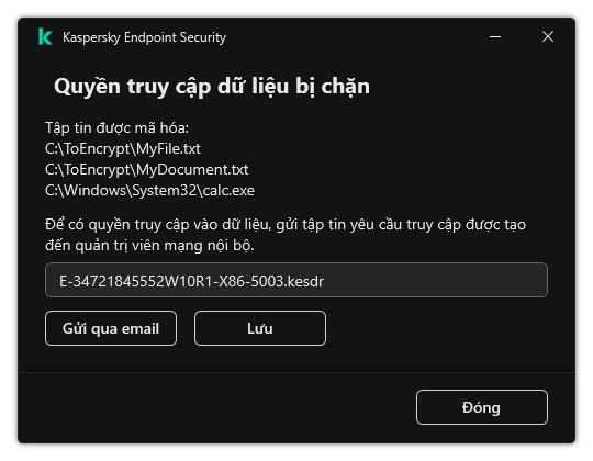 Sau khi mã hóa dữ liệu, Kaspersky Endpoint Security có thể hạn chế quyền truy cập vào dữ liệu ví dụ như do sự thay đổi trong cơ sở hạ tầng của tổ chức và thay đổi trong Máy chủ quản trị Kaspersky Security Center. Nếu người dùng không có quyền truy cập vào dữ liệu được mã hóa, người dùng có thể yêu cầu quản trị viên truy cập vào dữ liệu đó. Nói cách khác, người dùng cần gửi cho quản trị viên tập tin yêu cầu truy cập. Sau đó, người dùng cần tải tập tin phản hồi nhận được từ quản trị viên lên Kaspersky Endpoint Security. Kaspersky Endpoint Security sẽ cho phép bạn yêu cầu truy cập dữ liệu từ quản trị viên thông qua email (xem hình bên dưới).