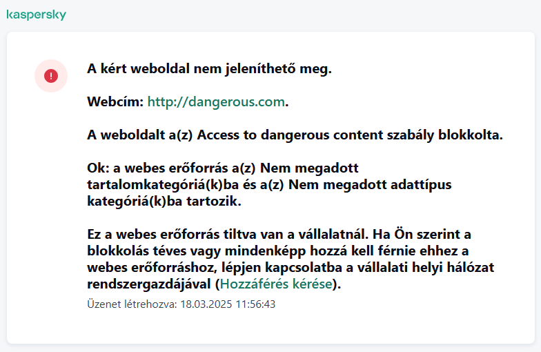 Figyelmeztető üzenet. Ez az üzenet figyelmezteti a felhasználót, hogy a webes erőforrást nem ajánlott felkeresni és / vagy ellentétes a vállalati biztonsági szabályzattal. A Kaspersky Endpoint Security akkor jelenít meg figyelmeztető üzenetet, ha a Figyelmeztetés lehetőség van kiválasztva a webes erőforrást leíró szabály beállításaiban.