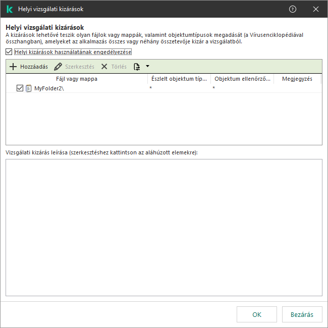 Új kizárás. A Kaspersky Endpoint Security egy új vizsgálati kizárást ad hozzá a lista gyökeréhez.