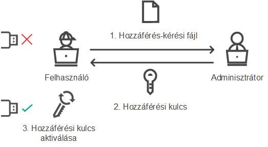 Csak akkor adhat offline módban való hozzáférést a blokkolt eszközökhöz, ha a Kaspersky Security Center működik a rendszerben, és a rendszabály alkalmazva van a számítógépen. A rendszabálybeállításokban az Device control részben az Ideiglenes hozzáférési kérelem engedélyezése jelölőnégyzetet be kell jelölni.