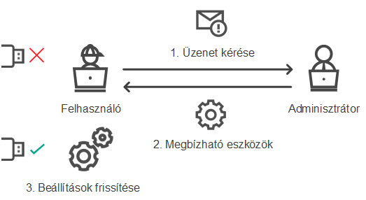 Csak akkor adhat online módban való hozzáférést a blokkolt eszközökhöz, ha a Kaspersky Security Center működik a rendszerben, és a rendszabály alkalmazva van a számítógépen. A számítógépnek képesnek kell lennie kapcsolatot létrehozni az Adminisztrációs kiszolgálóval.