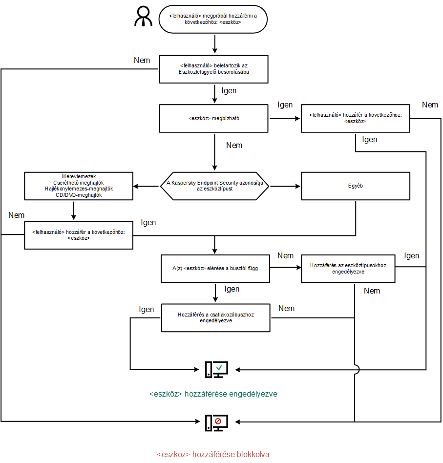 A Kaspersky Endpoint Security döntést hoz az eszközök hozzáférésének engedélyezéséről, miután a felhasználó a számítógéphez csatlakoztatja őket (lásd az alábbi ábrát).