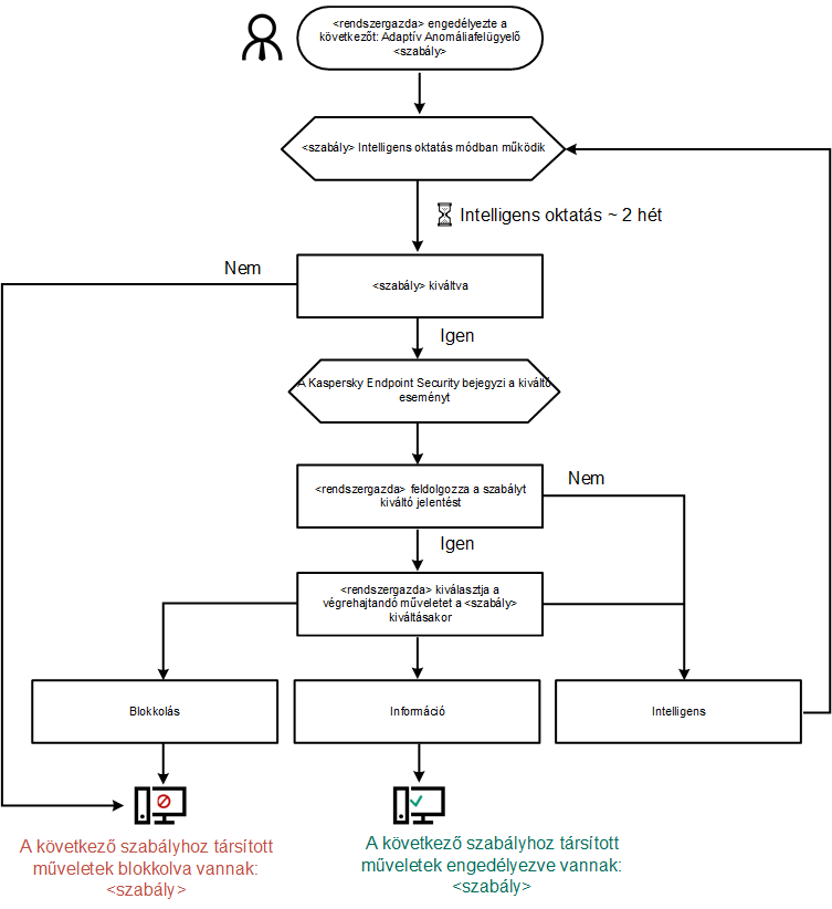 Ha egy szabály betartását a tanulási időszak során egyszer se váltották ki, akkor az Adaptív Anomáliafelügyelő az adott szabályhoz kapcsolódó tevékenységeket gyanúsnak fogja minősíteni. A Kaspersky Endpoint Security le fog tiltani az adott szabályhoz kapcsolódó minden tevékenységet.
