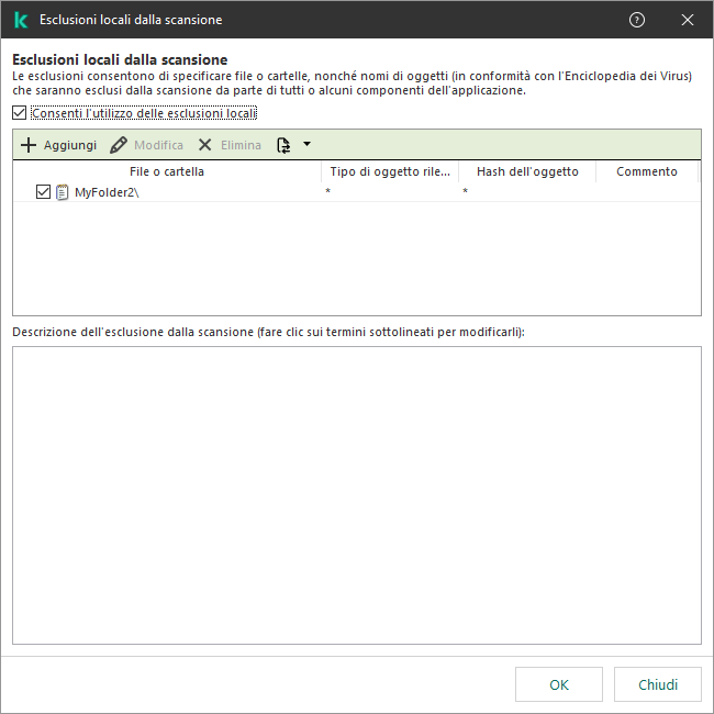 Verrà visualizzata una finestra contenente un elenco di esclusioni locali.