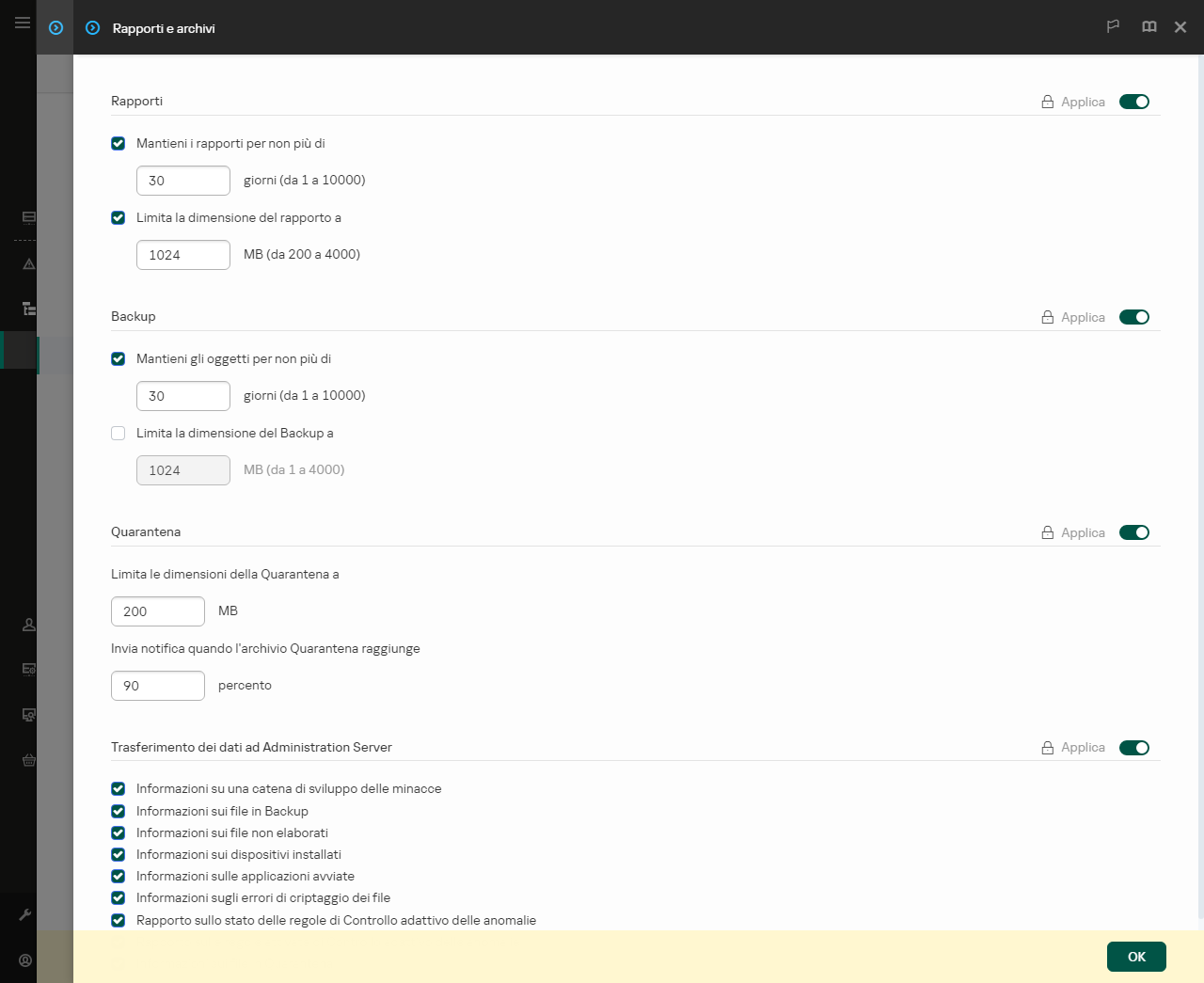 Per mantenere aggiornato il database delle applicazioni installate, è necessario abilitare l'invio delle informazioni dell'applicazione ad Administration Server (abilitato per impostazione predefinita).
