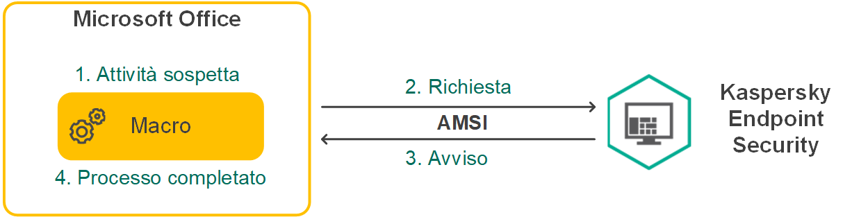 Il componente Protezione AMSI è progettato per il supporto dell'interfaccia AMSI (Antimalware Scan Interface) di Microsoft. AMSI (Antimalware Scan Interface) consente ad applicazioni di terzi con il supporto AMSI di inviare oggetti (ad esempio script di PowerShell) a Kaspersky Endpoint Security per un'ulteriore analisi e quindi di ricevere i risultati della scansione di questi oggetti. Tra le applicazioni di terzi possono essere incluse, ad esempio, le applicazioni Microsoft Office (vedere la figura di seguito). Per informazioni dettagliate su AMSI, consultare la documentazione di Microsoft.