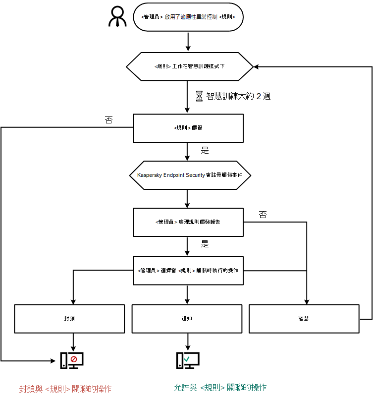 如果在訓練期間某條規則完全未觸發,“自適應異常控制”會將與此規則關聯的操作視為非典型操作。Kaspersky Endpoint Security 將封鎖與該規則相關的所有操作。