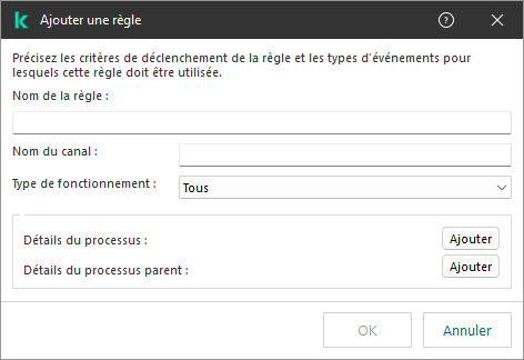 Kaspersky Endpoint Security associe les critères de déclenchement de la règle à un ET logique.